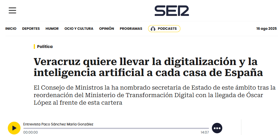 Esta es la entrevista como nueva Secretaria de Estado de Digitalización e IA que me ha hecho Paco Sánchez en el Hoy por hoy de la Cadena SER en la Región de Murcia.